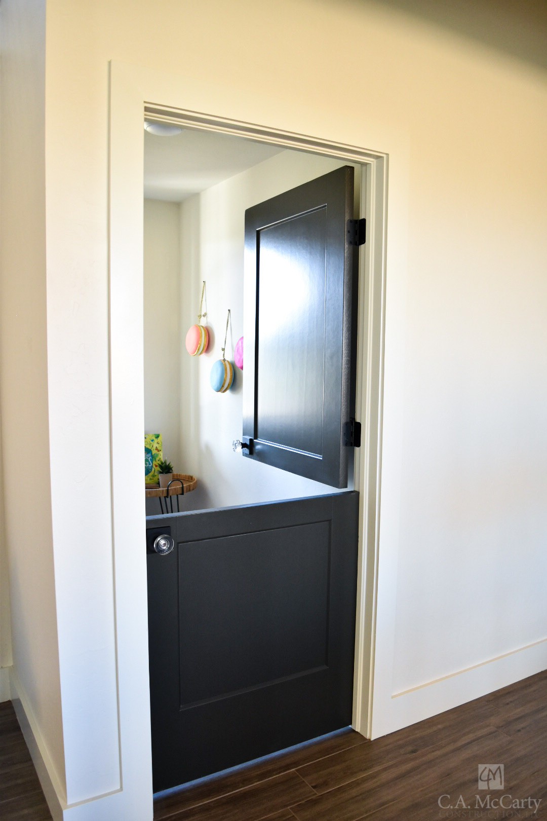 The space offers a French country feel with pops of color, unique finishes and details. The master bathroom is finished with timeless marble tile and a coffee bar. The second floor includes two bedrooms, each with their own charming bathrooms, as well as a fun and colorful flex room. Other home features include a quaint space under the stairs with a Dutch door, lockers with custom storage cabinets, whimsical wallpaper in the powder bath, a thoughtful office space, spacious storage pantry, and laundry room loaded with storage.